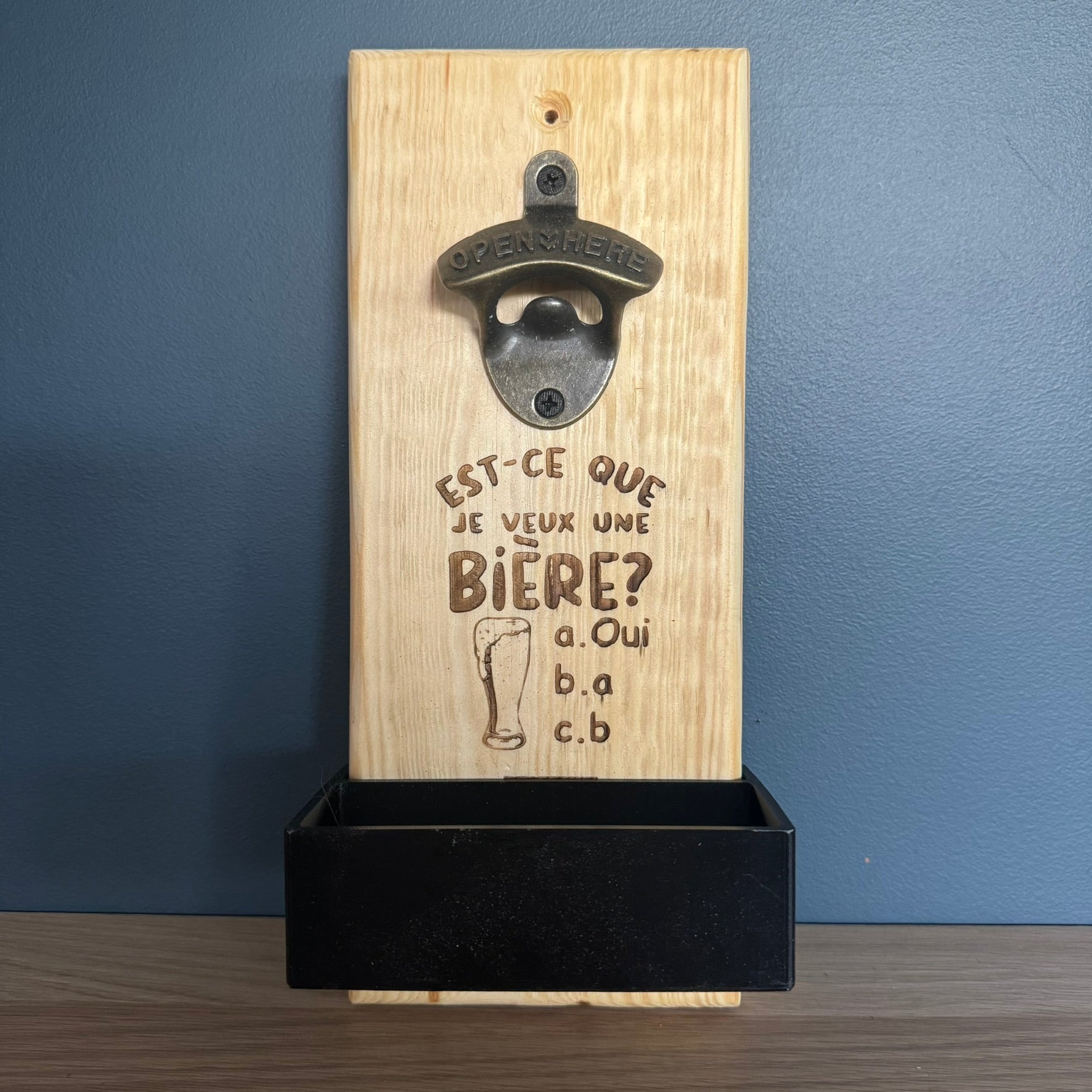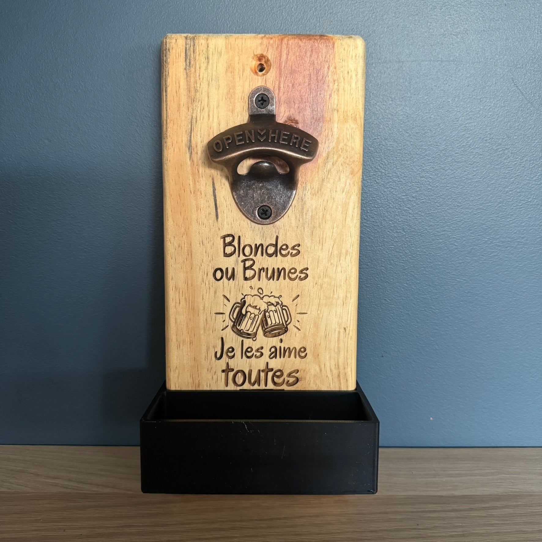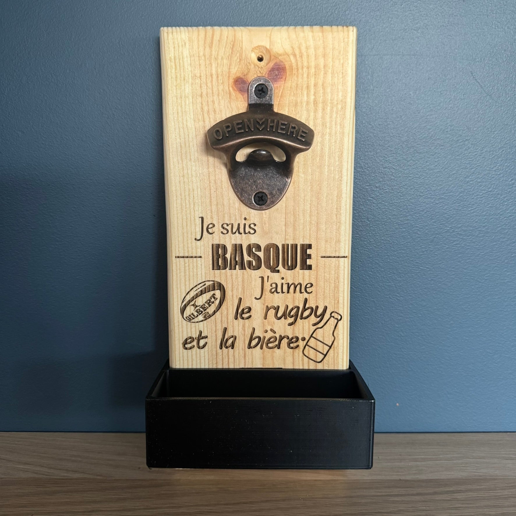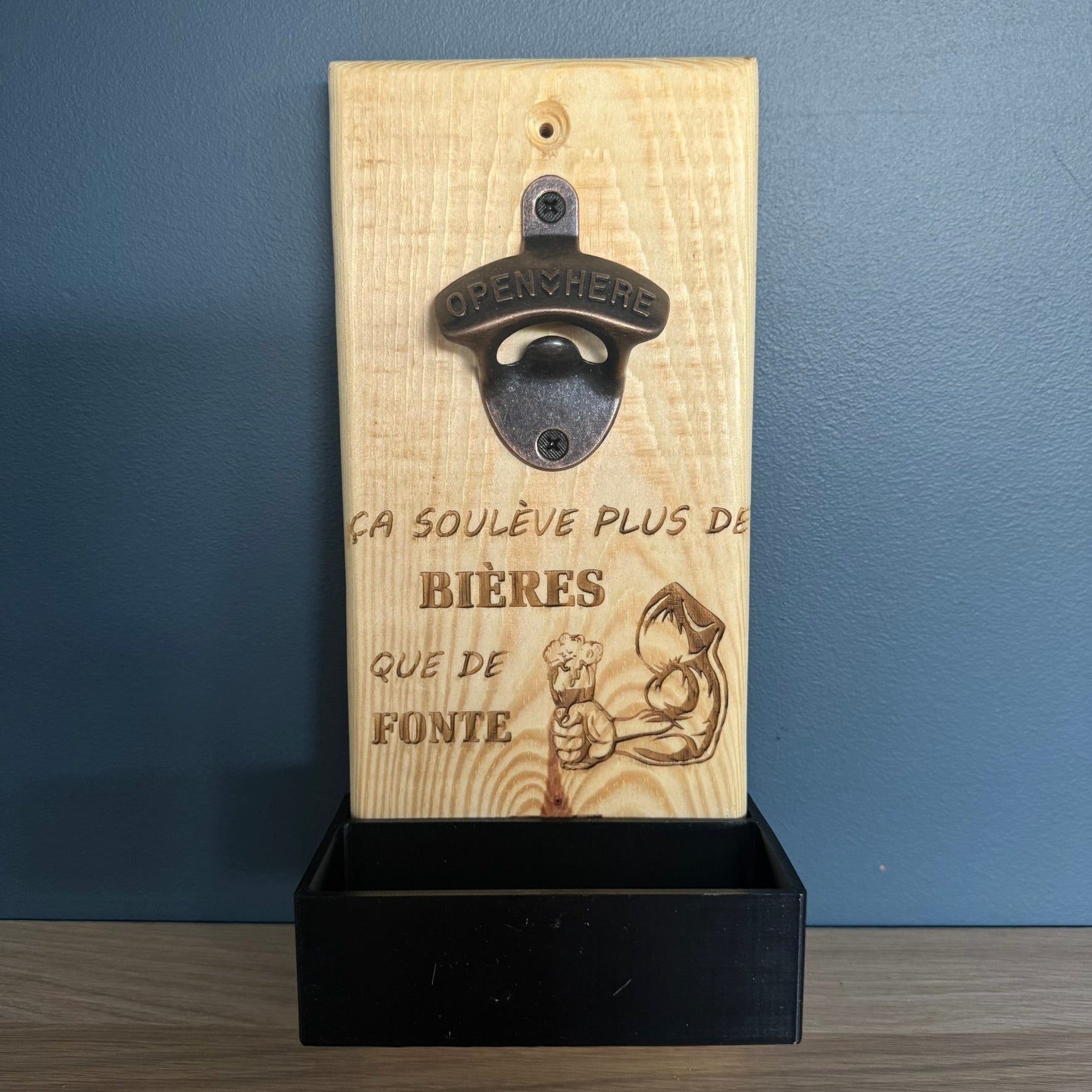 Décapsuleur en bois de 28cm de haut et 12cm de large avec récupérateur de capsules à fixer au mur.