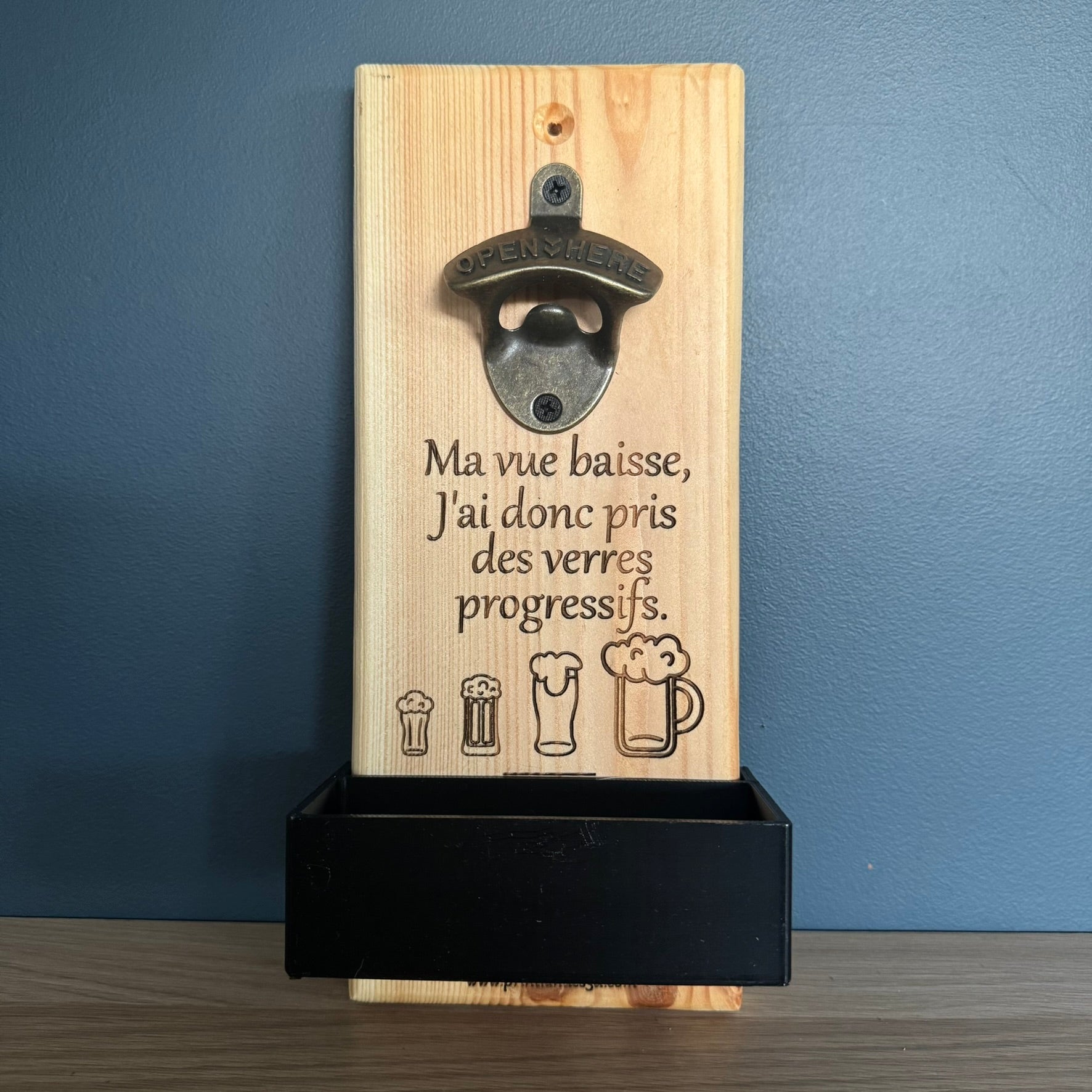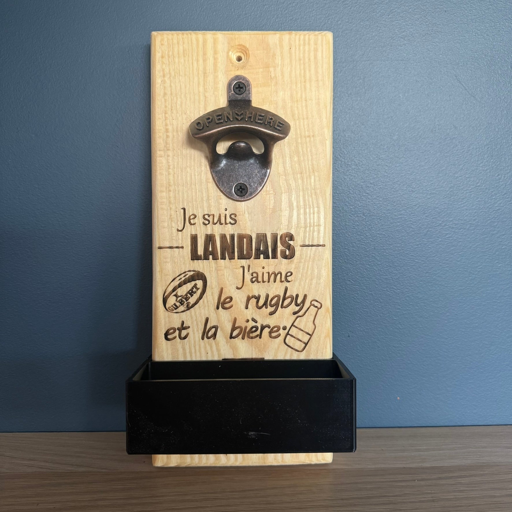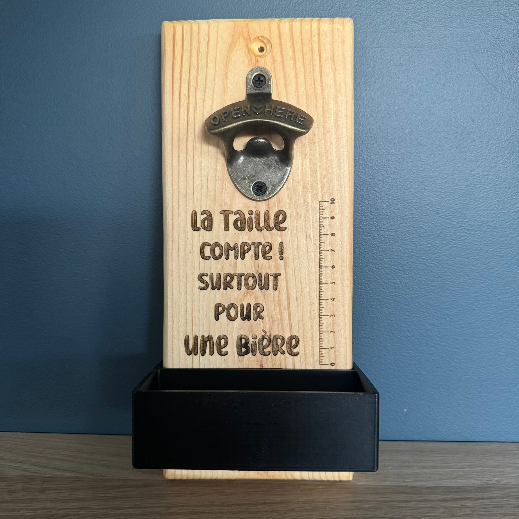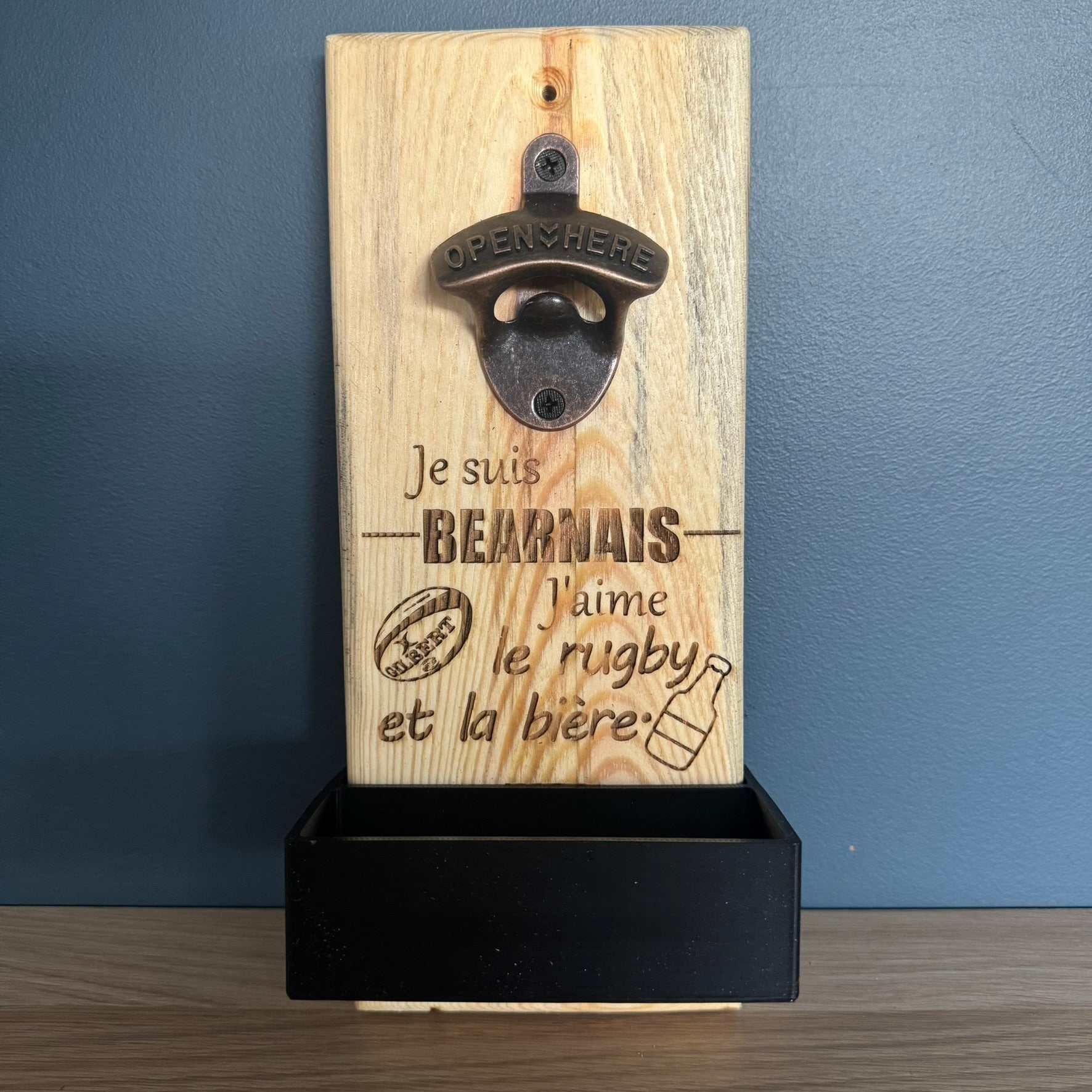 Décapsuleur en bois de 28cm de haut et 12cm de large avec récupérateur de capsules à fixer au mur.